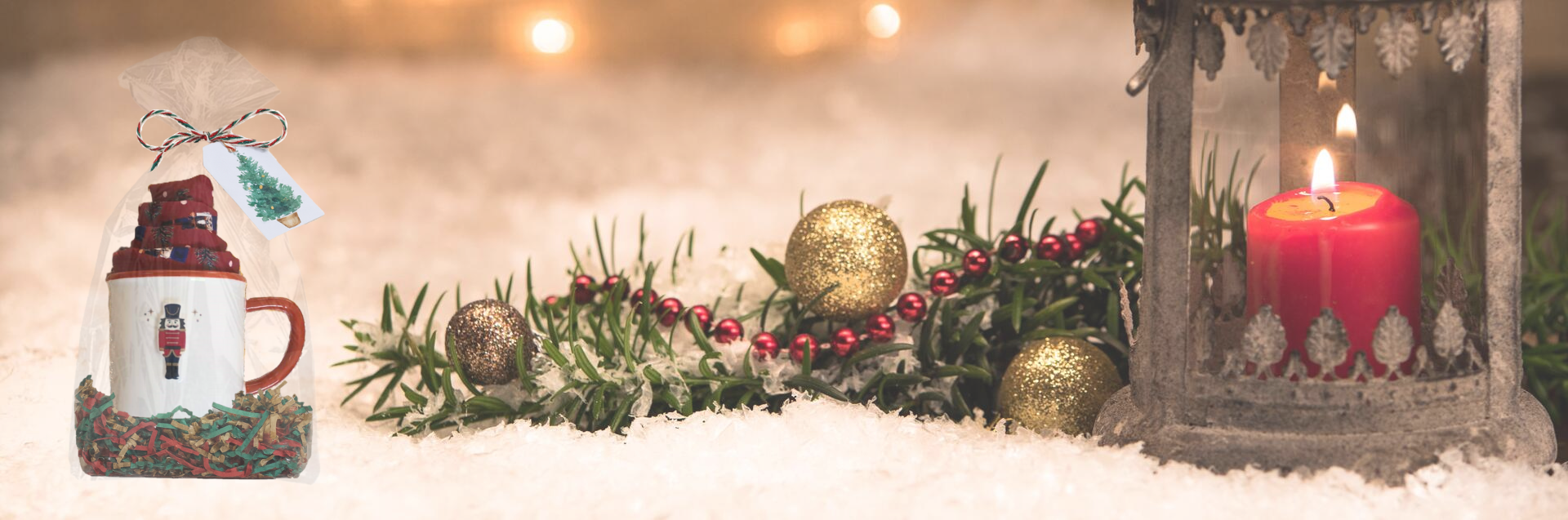 Coordinated mug and tea towel, wrapped with love in a transparent gift bag with a bed of Christmas-coloured shredded paper, tied with coordinating festive twine and finished with a gift tag.